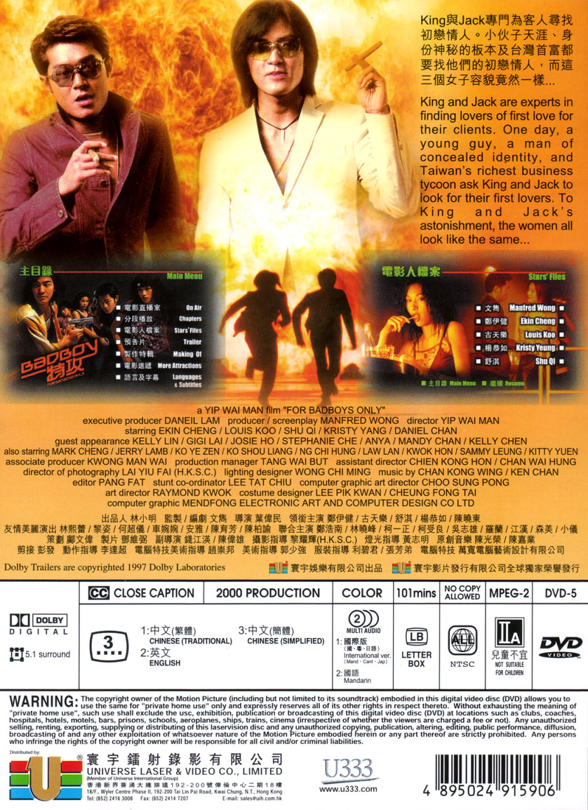>Extras consist of the usual batch of trailers and bios, plus a 15 minutes featurette on the production, subtitled in both English and Chinese. This is actually above average. There's plenty of footage with Ekin Cheng goofing around. He mentions that he fears for his life, now that the shoot is over, because he has offended the entire crew during production! Other than that the feature consists of short interviews, some of them played for fun, and some great behind the scenes footage, for example we get to see Shu Qi being cyber-scanned. There's also some before and after versions of several effect shots.